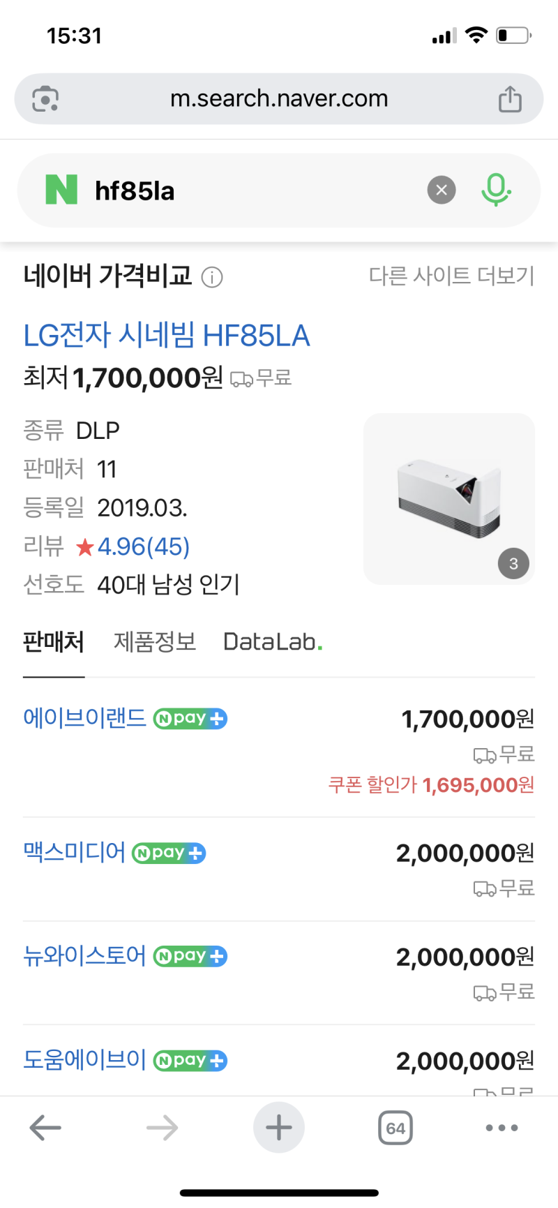 모델명은 HF85LA 당시 한국에서 160만원에 구입했습니다.