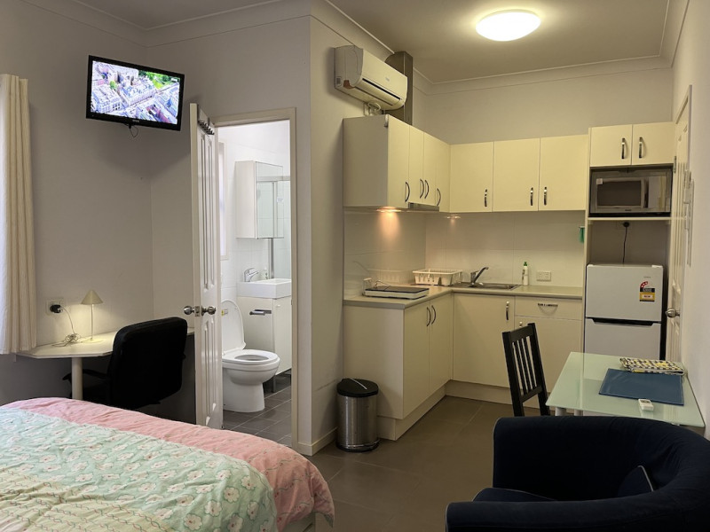 配有微波炉/烤箱,冰箱,橱柜。 hot plate, toaster, kettle.和基本的餐煮器具。书桌椅和很多电源插孔。内嵌衣橱,双人床有四个大储物柜.餐桌椅,还有沙发椅。电视,空调,电扇。
