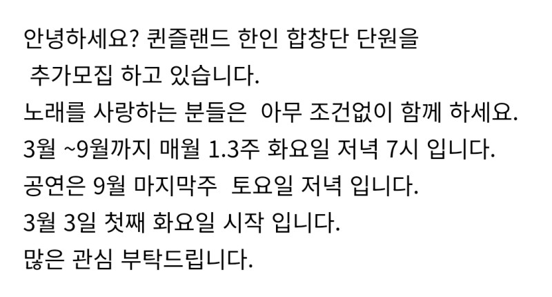 퀸즐랜드 한인 합창단 단원을 추가모집 하고 있습니다
