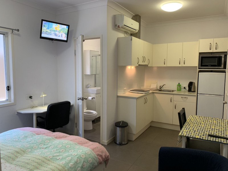 Self-contained, air-conditioned, FF and cozy studio flat is integrated with bedroom, bathroom, kitchen, living and studying area.
