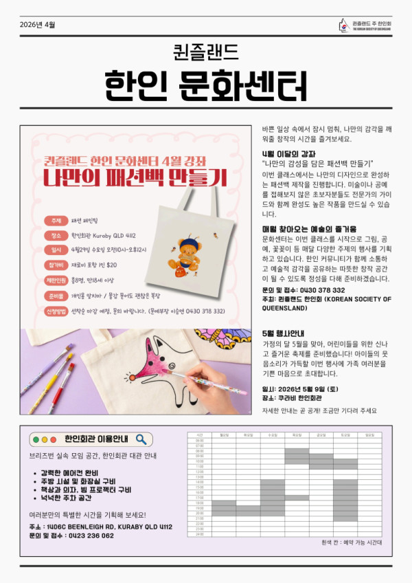 수업장소: 퀸스랜드주한인회관