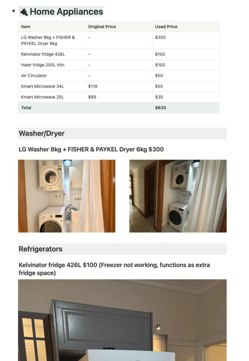 귀국 일정이 확정되어 6개월간 사용한 가구/가전을 급하게 정리합니다.