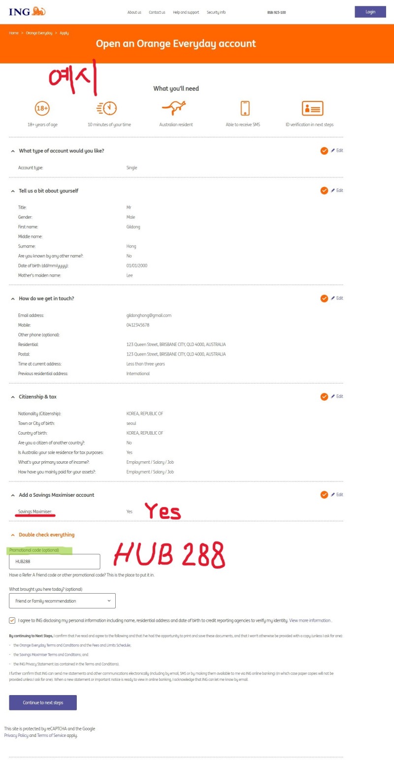 1. Orange Everyday 계좌를 개설한다 (http://ing.com.au/everyday) 어려우시면 아래 예시 있어요
