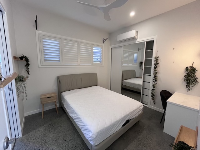 卧室配稳定的Queen床和舒服的床垫,全新DeRucci购买。定制的带抽屉的书桌,内嵌大衣橱带镜子的拉门,里面很多细致的抽屉。当然, 还有空调,在你需要的时候,随时使用。