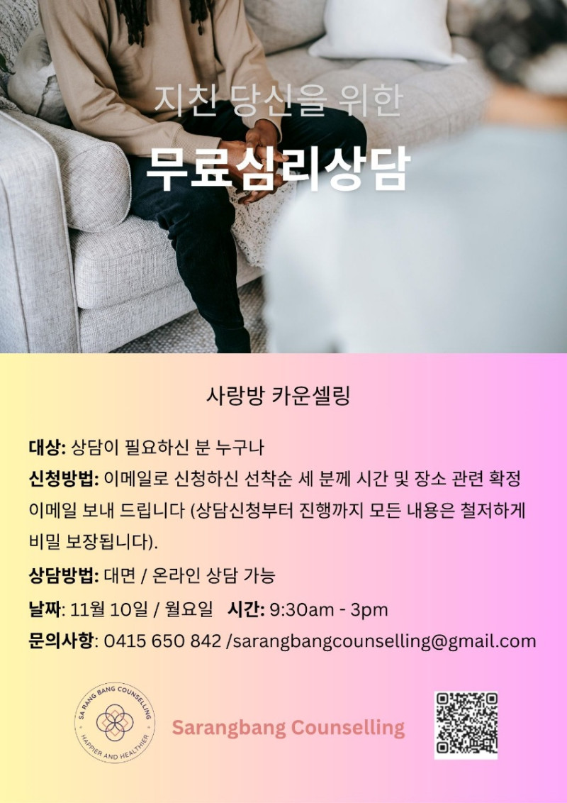 11월 10일 따뜻한 차 한잔과 함께하는 이야기 나눔 쥬디사랑 2025.10.20 07:19 17 0 - 첨부파일 : 지친 당신을 위한 공간 11.jpg (247.1K) - 다운로드 0 2025-10-20 07:19:41 - 짧은주소 : http://www.sunbrisbane.com/brsb/bbs/?t=7MEe 주소복사 × 짧은 글주소 복사 복사하기 Note! '복사하기' 버튼을 클릭하면 내 컴퓨터 클립보드에 복사됩니다. 목록 본문 . 댓글목록 0 등록된 댓글이 없습니다.