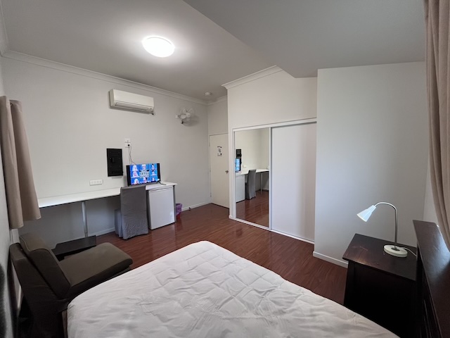 // quite small room with single bed, built-in wardrob,desk &chair, drawers, TV, Fridge, A/C,Fan, WiFi,