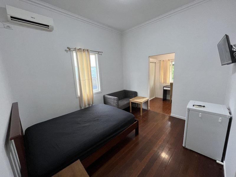 2,,Room +study is equipped with double bed, built-in wardrobe. Desk and chair, bookcase, armchair, coffee table. TV, fridge, air-conditioner, remote fan. High ceiling and City view .wi-fi!