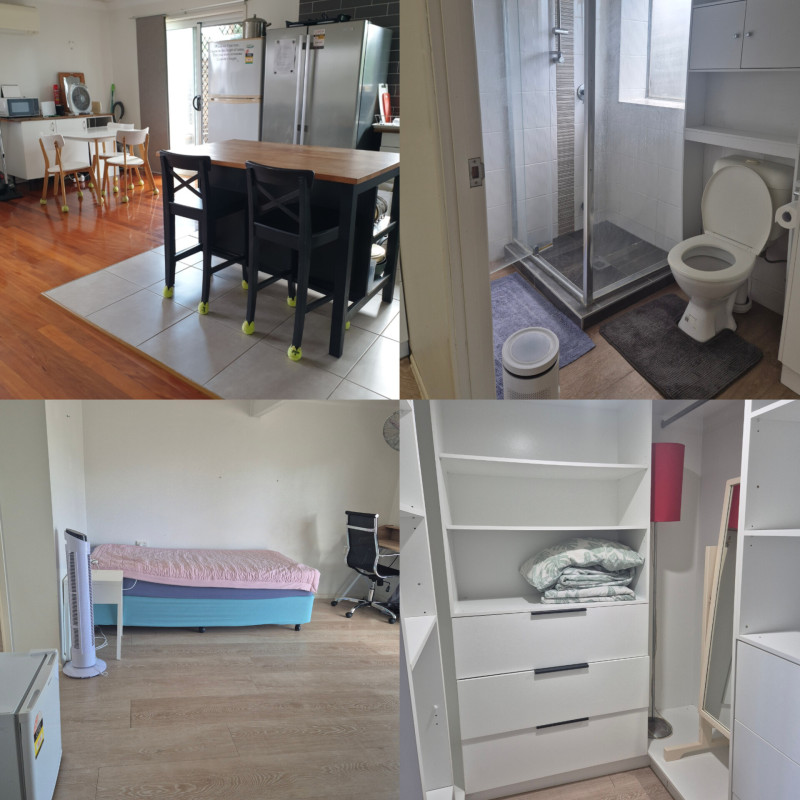 작은 드레스룸이 따로 있는 아늑한 마스터룸 입니다. 혼자 지내시기 넓고 너무 좋은 공간입니다 주방은 5분이 사용하시고 방에 작은 음료수 냉장고가 있어 사용 하시기 편합니다.