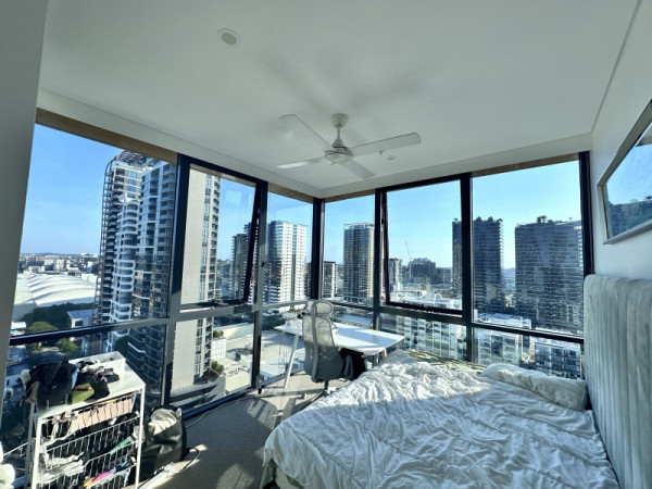 방에는 침대와 책상이 있고 붙박이장도 있어요.