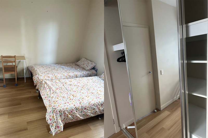 싱글침대 2개 (붙여써도 따로 써도 되는^^)와 침구류, 테이블 책상, 넉넉한 붙박이장 (천장이 높아 윗부분에 트렁크 보관 가능) 있습니다.
