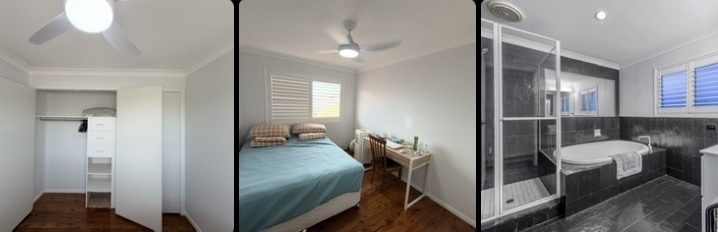 방은 깔끔하며 창문이 뒷마당 쪽에 있어서 통풍이 잘 됩니다. 방안에는 퀄리티 좋은 퀸배드, 에어컨, 책상, 선풍기 와 옷장이 구비 되어 있습니다.