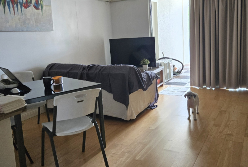 집에는 저희 커플과 말티푸 한마리와 함께 지내고 있습니다! 강쥐는 얌전하지만 방에 출입 못 하도록 펜스 놔드립니다. 저희 둘 다 출근하거나 학교다니느라 평균 아침 7시에 나가서 5시, 9시에 들어옵니다. 풀타임이라 평일엔 마주칠 일이 거의 없어요.