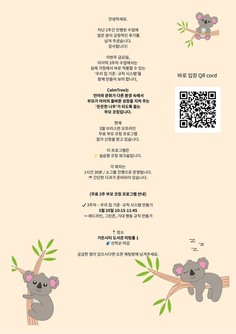 이번 주 금요일, 무료 자녀 양육 코칭 3주차 진행 됩니다.
